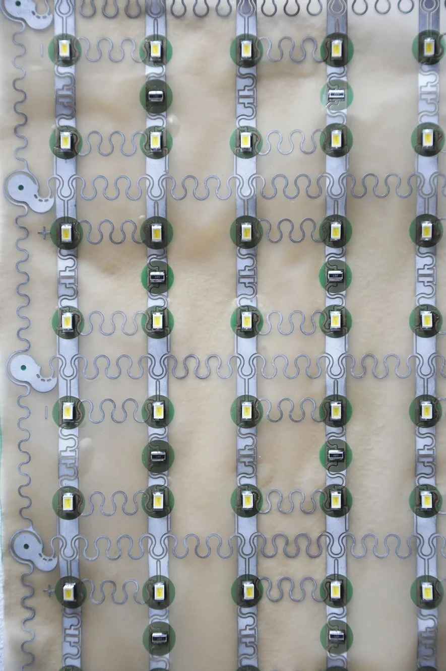 Canvas is a flexible textile light made with stretchable PCBs. Layers of LEDs, metallised yarn, and non-conductive fabric create a bendable, adaptable lamp. Moving or shaping Canvas produces new light patterns, making it versatile for different rooms and applications.
